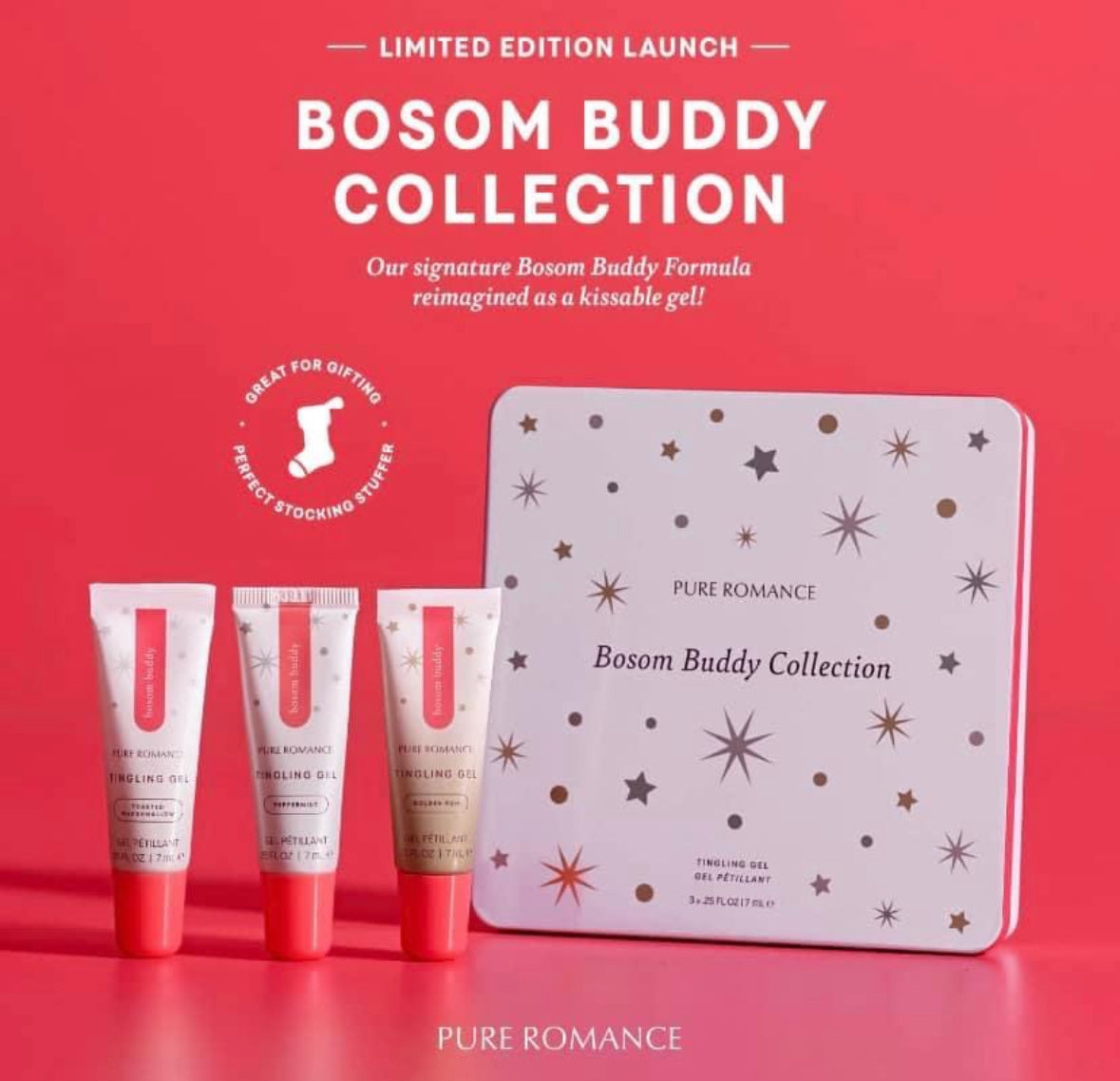 LIMITED SPECIAL Add a little fun to foreplay with our signature Bosom Buddy formula reimagined in 3 kissable gels! Moisturizing ingredients and mouthwatering flavors make this limited edition collection perfect for your lips and your taste buds Collection contains kissable gels in 3 flavors: Peppermint, toasted Marshmallow Golden Rum Gives foreplay a tingling twist ane added sensation. Use it on nips or lips for a tasty treat you'll both LOVE! Moisturizes with ultra-hydrating shea butter and botanicals 3x 0.25 FL.OZ./7 mL
