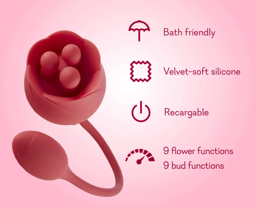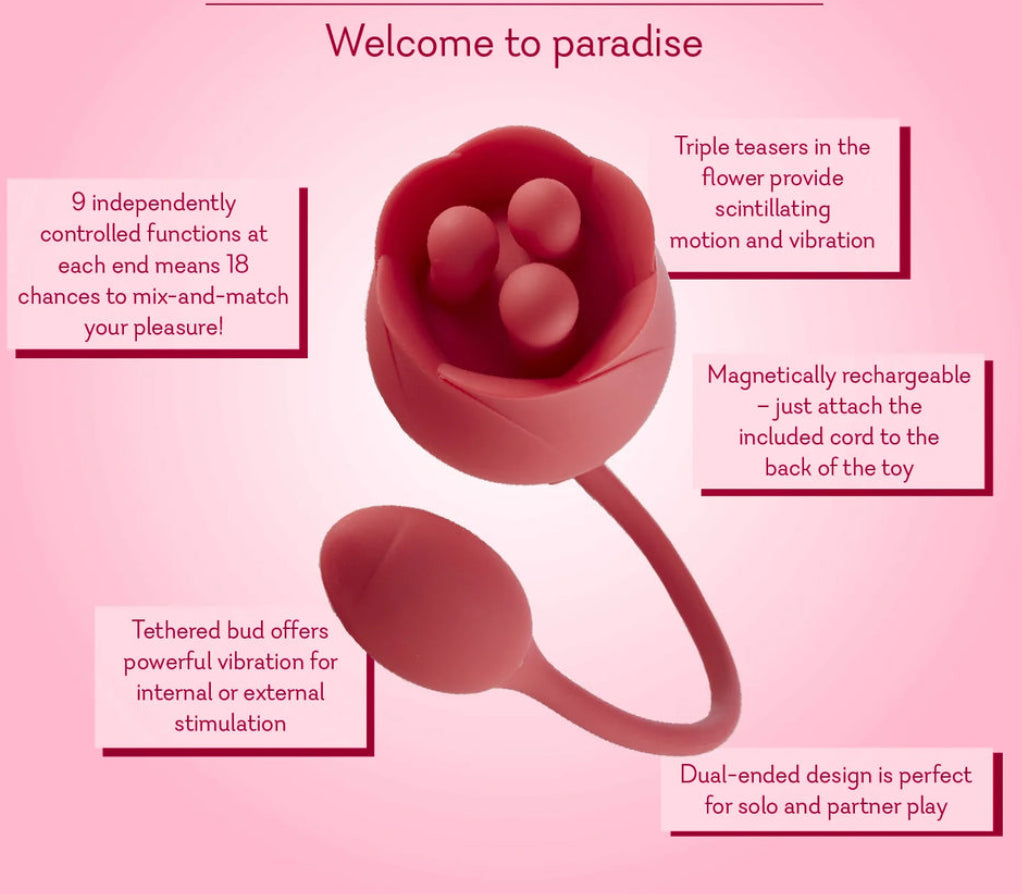 It’s time to let pleasure bloom – with Erotic Eden. Plucked direct from paradise, this dual-ended flower vibrator features a triple teaser rose on one end, and an ultra-powerful vibrating bud on the other. Each end is independently controlled with 3 speeds and 6 patterns apiece, so you can mix-and-match to your heart’s content. Erotic Eden can be used solo or even shared with a partner. Press the bloom to your clit0ris for thrilling sensation and vibration as the triple teasers move and rotate. Or enjoy the powerful stimulation of the vibrating bud. Use both together by inserting the bud vaginally or in the Backdoor – or pass it off to a partner so you can both enjoy it together.