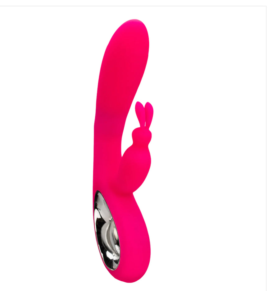 Ready to bunny-hop to bliss? Well, meet Hoppy Go Lucky. This dual-action vibrator features a looped handle, a rabbit-eared clit0ral stimulator, and a flexible silicone shaft. This pink powerhouse will have you jumping for joy with its 72(!) combined vibrating features – 36 in the flexible shaft and another 36 in the clit0ral teaser. Each motor is independently controlled so you can mix and match speeds and patterns and find your perfect combo. Features • The flexible silicone shaft moves as your body moves • Soft clit0ral teaser features twin rabbit ears for thrilling stimulation • The looped handle is easy to hold and ensures total control • 72 functions: 36 vibrating shaft modes and 36 clit0ral speeds and patterns • Independently controlled functions for mix-and-match pleasure • Rechargeable: Compatible with replacement charger PureCharge USB Cord – E. • Charging port is conveniently located in the tip of the handle and can be identified by a small circular depression. • Shower Friendly: Toy doesn’t mind a little water, but do not submerge! • Run Time: 45 minutes (high) to 1 hours (low). Charge Time: 1.5 hours. • Insertable Length: 4.5 in./11.4 cm, Insertable Width: 1.25 in./3.2 cm Directions Before use, charge completely. Light blinks during charging and remains illuminated when charging is complete. Maximum Noise Level: ≤ 40 dB. To turn on clit0ral teaser, hold top button for 3 seconds. To cycle through speeds and patterns, push top button. To turn off clit0ral teaser only, hold top button for 3 seconds. To turn on shaft, hold bottom button for 3 seconds. To cycle through speeds and patterns, push bottom button. To turn off shaft only, hold bottom button for 3 seconds. For optimal battery life, ensure product is turned off when not in use and fully recharge once every 6 months. CARE: Wash before and after each use. For best results, use Cleansing Mist.