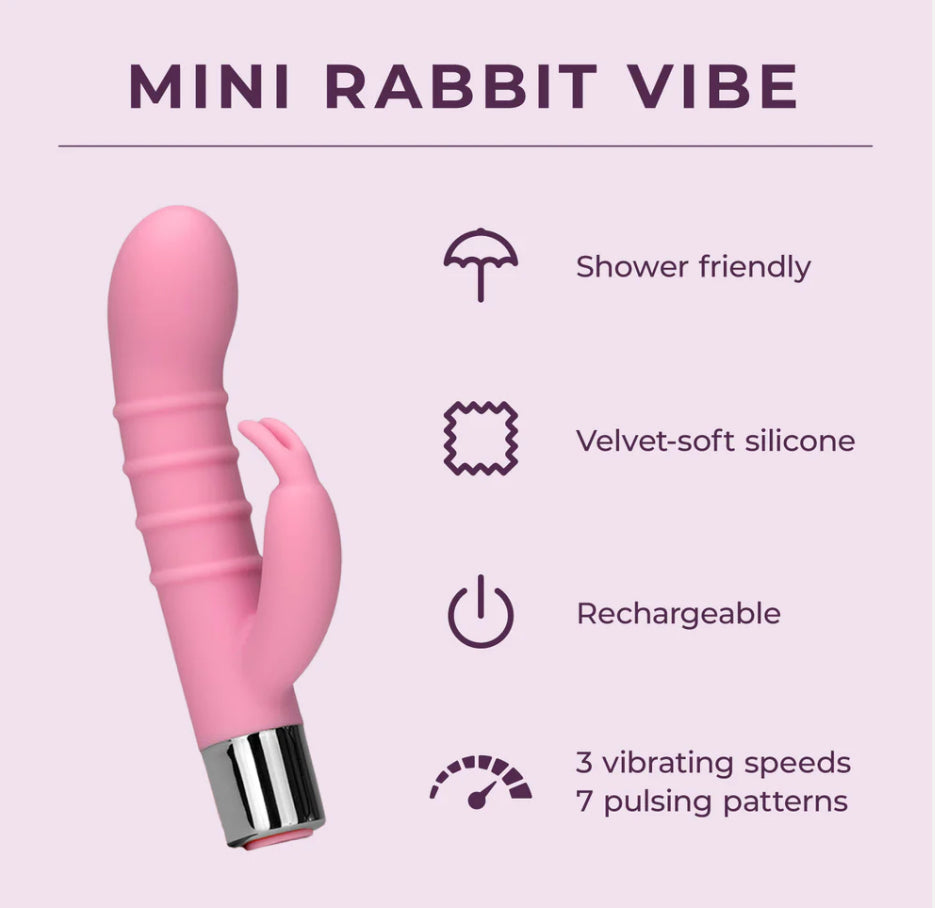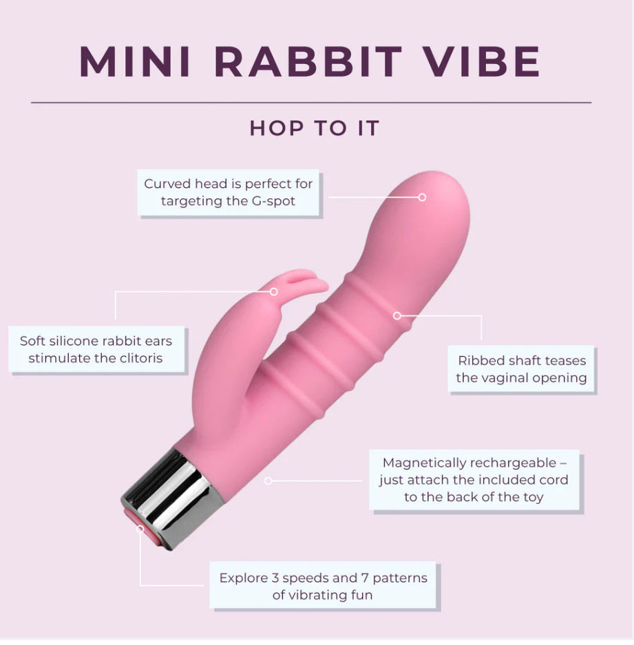 This Mini Rabbit Vibe is the perfect travel toy for any dual-action lover. It’s coated in velvet soft silicone for a pleasing feel, and features a ribbed shaft, clit0ral rabbit teaser, and a curved head perfect for targeting the G-spot. And with 3 speeds and 7 patterns of vibrating fun, you can pleasure yourself anyway – or anywhere – you please. Features • Small design makes it perfect for travel. • Ribbed shaft, rabbit teaser, and curved G-spot stimulator give you everything you need for pleasure. • 10 functions: 3 vibrating speeds and 7 pulsing patterns. • Rechargeable: Compatible with replacement charger PureCharge USB Cord – F. • Charging point is conveniently located on the bottom of the toy and can be identified by the two small metal charging contacts. • Shower Friendly: Toy doesn’t mind a little water, but do not submerge! • Run Time: 40 minutes (high) to 1 hour (low). Charge Time: 70 minutes. • Insertable Length: 3.25 in./8.3 cm; Insertable Width: 1.1 in./2.9 cm