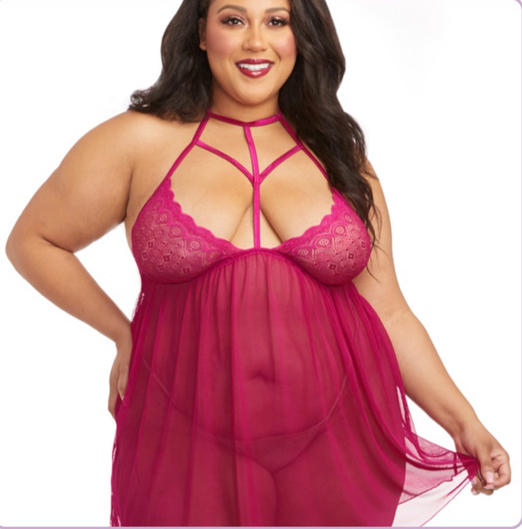 Meet your new favorite babydoll. The strappy collar and scalloped lace make for a style that's as trendy as it is sexy. Add your favorite panties or go without and tease in this raspberry babydoll.