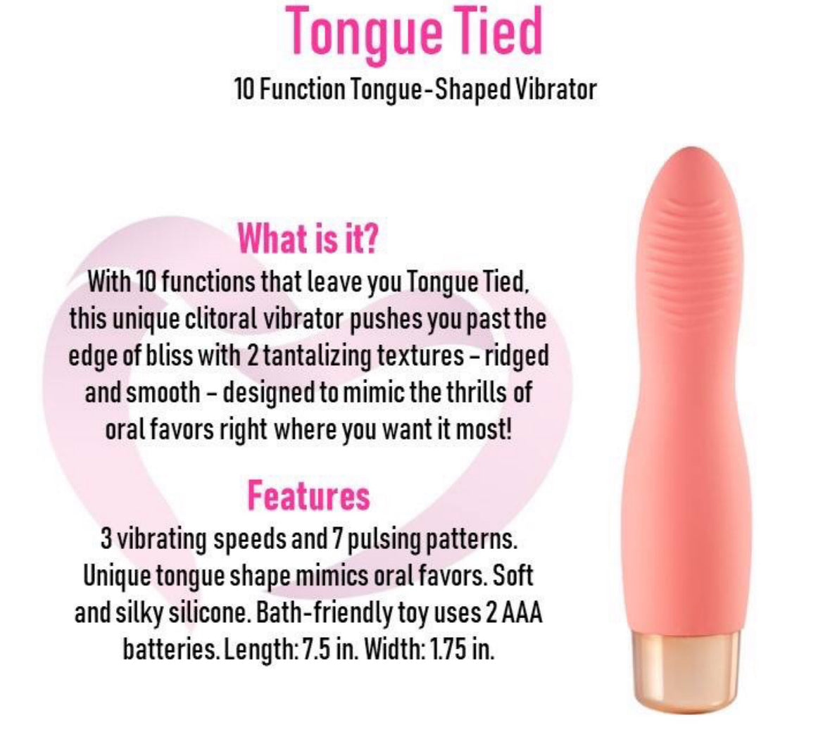 With 10 functions that leave you Tongue Tied, this unique clit0ral vibrator pushes you past the edge of bliss with 2 tantalizing textures -ridged and smooth - designed to mimic the thrills of oral favors right where you want it most! Features 3 vibrating speeds and 7 pulsing patterns. Unique tongue shape mimics oral favors. Soft and silky silicone. Bath-friendly toy uses 2 AAA batteries.Length: 7.5 in. Width: 1.75 in.